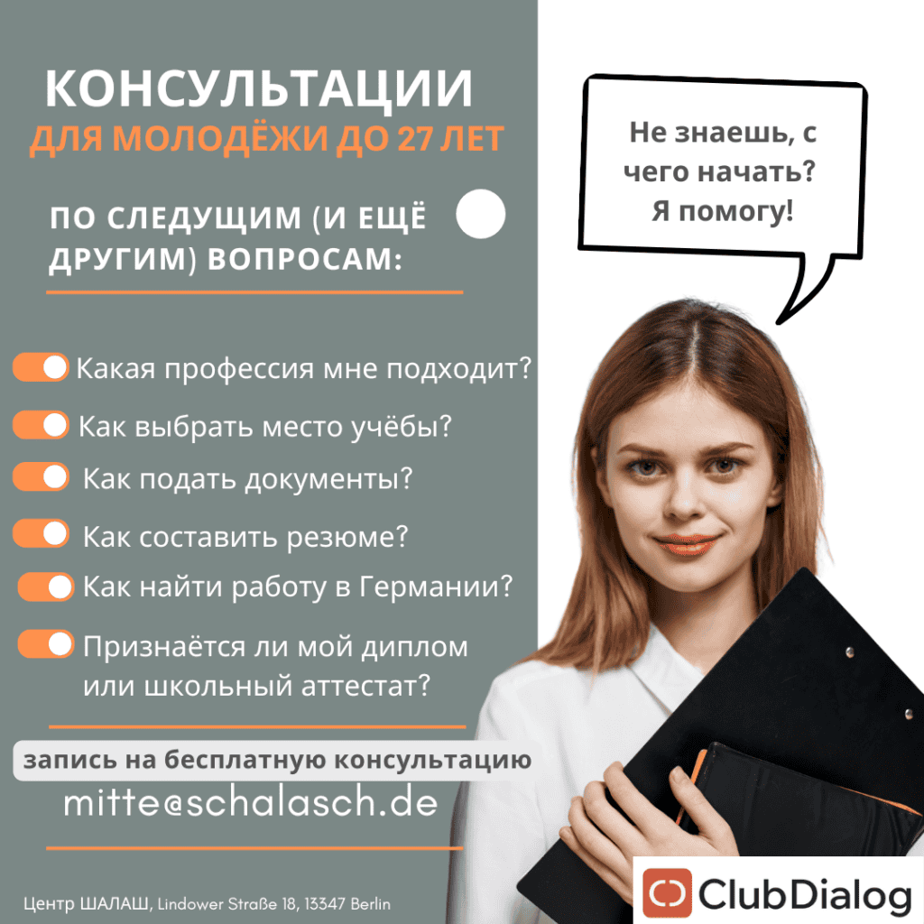 📍 Jugendberatung im Schalasch — проект Club Dialog e.V.Молодёжный центр «Шалаш»Lindower Str. 18, 13347 Berlin📞 030 285 994 85📧 mitte@schalasch.de